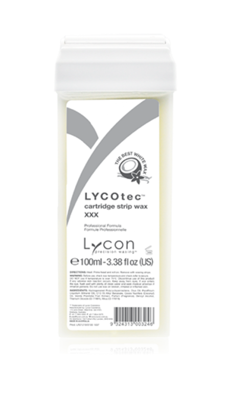 Lycon Lycotec White Hot Wax Cartridge 100ml with Titanium Dioxide, Coconut Oil and Vanilla LYCOtec is a new generation, high-tech, and strong white strip wax. Contains Coconut Oil, Titanium Dioxide and Micro Mica, for extra-gentle and effective waxing.