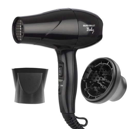 Silver Bullet Baby Travel Hair Dryer is a teeny tiny hair dryer with almighty power. This incredibly compact, light and travel-friendly hair dryer has a powerful airflow and 2 speed/heat settings for every hair type. Dual voltage for worldwide use, the Silver Bullet Baby Travel Hair Dryer is a styling superstar for on the go.