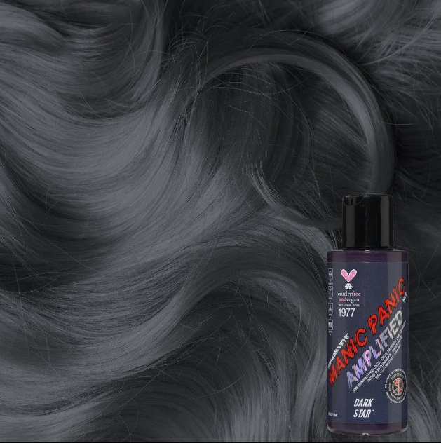 Dark Star is a very deep, slightly purple-toned grey hair dye. For best results, lighten your hair to the lightest level 10 blonde before use. Dark Star may also be used to make your favorite Manic Panic shades deeper for a custom tone.