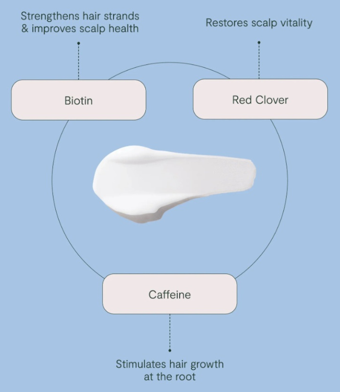 Biotin, Red Clover & Caffeine assist to build hair strand resilience & natural volume for oil-free styling, fullness & shine. Restores scalp vitality & assists to support the hair’s natural growth cycle for optimal scalp & hair health.