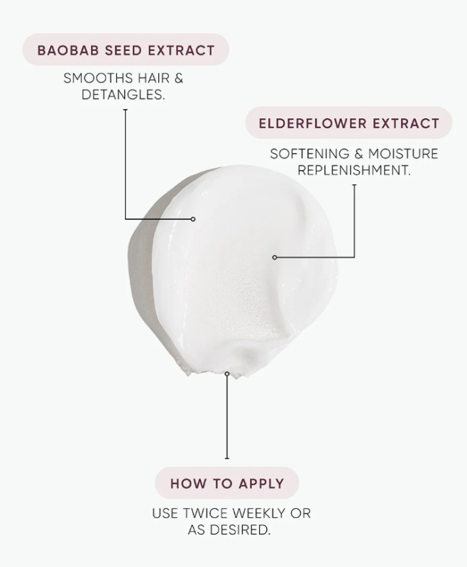 Our Signature Formula: A moisturising mask with Baobab Seed and Elderflower Extract to deeply rehydrate your hair. Enriched with our Signature Peptides and Ectoin Barrier Booster that assist to repair and strengthen, nurturing the scalp microbiome for your healthiest hair.