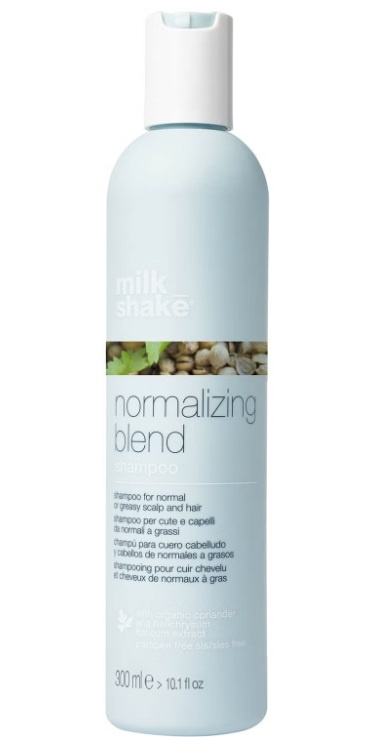 milk_shake normalizing blend shampoo is the professional solution to remove greasy residue with a deep normalizing action, whilst respecting the delicate physiological balance that governs sebum production in the scalp. milk_shake® normalizing blend shampoo is much more than just a simple cleanser or a beauty routine cleansing gesture. It's a real treatment for the hair and is unique in its amazing benefit for scalp and hair. Its formula with organic coriander and helichrysum extracts, cedar and coriander essential oils, and a balanced mix of delicate cleansers, cleanse deeply yet gently, removing sebum and oily residue delicately, improving the delicate and healthy balance of sebum production.