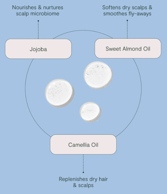 Jojoba, Sweet Almond & Camellia Oils assist to reduce frizz & infuse skin-protectives for optimal hair condition & shine.